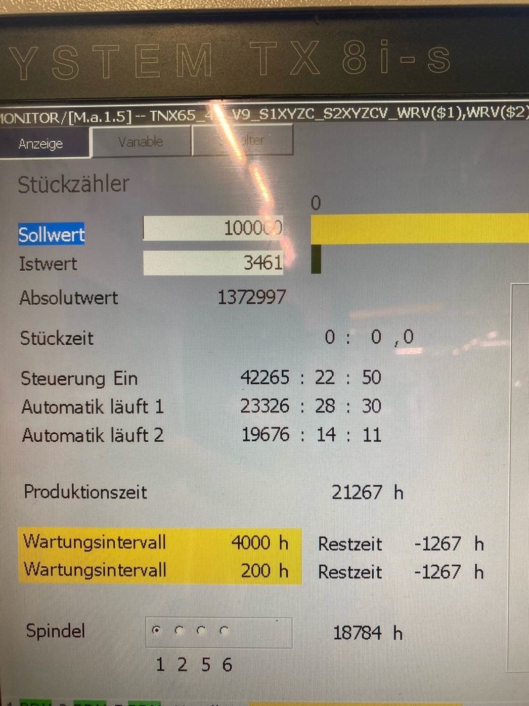 Traub CNC Drehmaschine TNX65, TX8i-s, Bj. 2011 Beschreibung: Typ: TNX 65 Baujahr: 2011 Steuerung: TX 8i-s Haupt / Gegenspindel Stangendurchlass bis 65 mm, 3 Revolver, 3 x Y-Achse, angetr. Werkzeuge, 2 x C Achse, Gegenspindel, Späneförderer, Bandfilter, Kühlschmierstoffanlage, Teileband, Viel Zubehör ca. 4 angetr. Werkzeughalter, 15 starre Halter Kurzlader Breuning ca. 114.586 Einschaltstunden ca. 51.400 Produktionszeit Zustand: Guter Zustand Unter Strom, zu besichtigen Lieferzeit: Ca. 2 Wochen, nach Vereinbarung