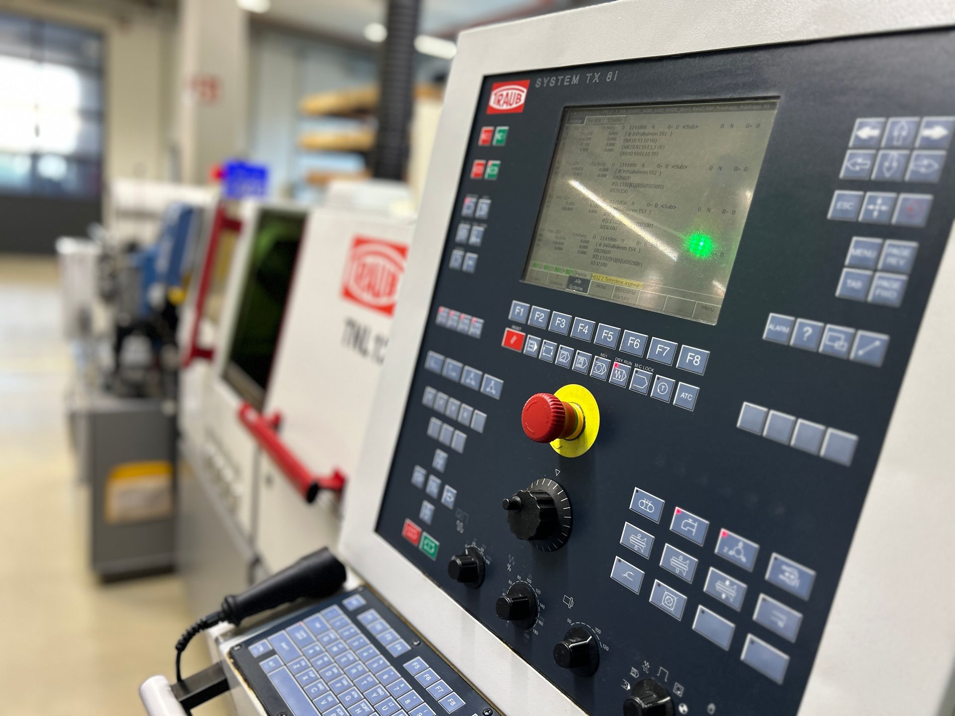 Traub CNC Drehmaschine TNL12, TX8I, Bj.2008, Ma.Nr.>850 C-Achse, Bremse auf HSP und GSP, rot. Werkzeugantrieb, FMB Minimag 18 Stangenlademagazin, nur in Öl gelaufen, Spänewanne, kein Späneförderer. (Ohne Absaugung, ohne Werkzeuge) Werkzeuge können nach Bedarf und Verfügbarkeit angeboten werden. Guter Zustand, unter Strom bis ca.24.02.2026 Ab Standort/Abbau, wie besichtigt, getestet.