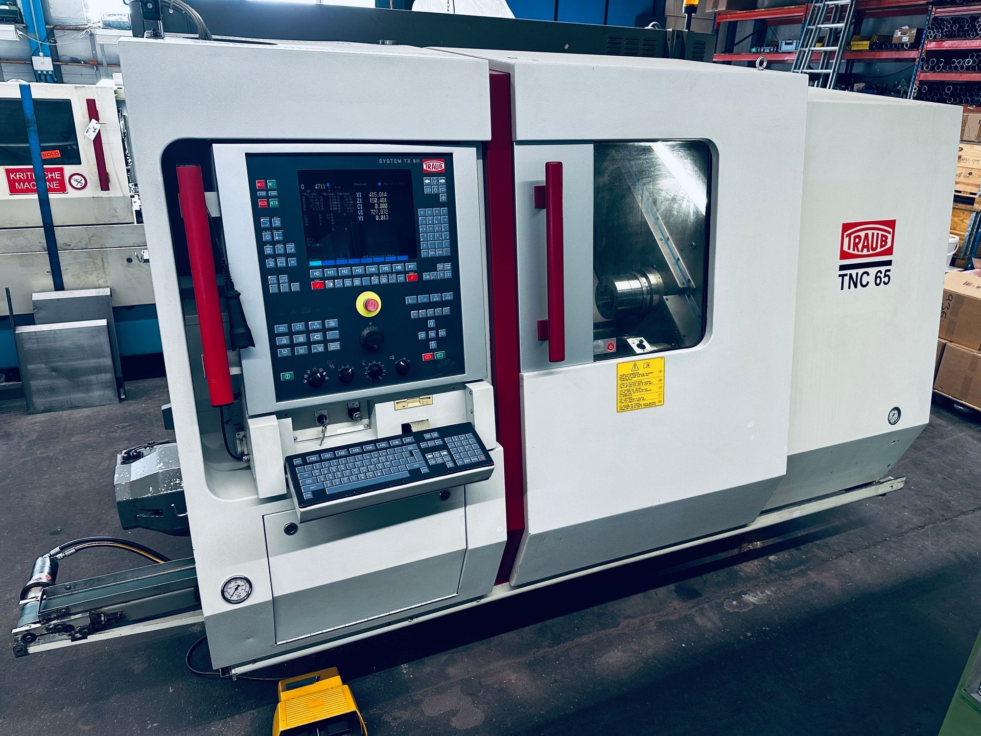 Traub CNC Drehmaschine TNX65, TX8i-s, Bj. 2009 Typ: TNX 65 Baujahr: 2009 Steuerung: TX 8i-s Haupt / Gegenspindel Stangendurchlass bis 65 mm, 3 Revolver, 3 x Y-Achse, angetr. Werkzeuge, 2 x C Achse, Gegenspindel, Späneförderer, Bandfilter, Kühlschmierstoffanlage, Teileband, Viel Zubehör ca. 4 angetr. Werkzeughalter, 15 starre Halter ca. 25.000 Spindelstunden Sehr guter Zustand, nur in Öl gelaufen Unter Strom, zu besichtigen